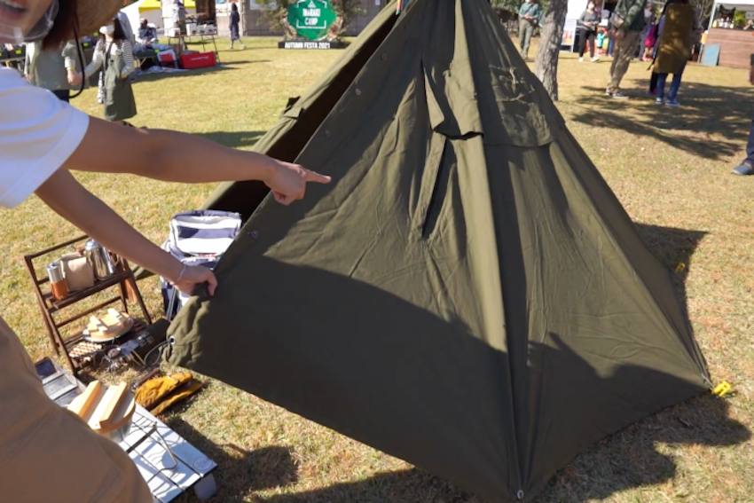 無骨でカッコいいからという、シンプルな理由で選んだテントはポーランドの軍用品。「広げてオープンに使用することもできますし、もちろん閉じて使うことも。専用の穴が開いているので冬は中に薪ストーブを入れてパンなんかを焼いています」