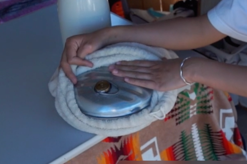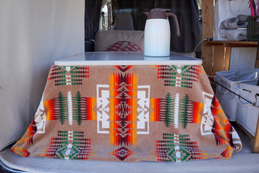 とてもシンプルな火にかけるタイプの湯たんぽを2個、こたつの中に入れて使用。車中泊・初心者でまだポータブル電源までそろえていない人は、ちょもかさん同様、まずは湯たんぽを使ってみるのもありですね!