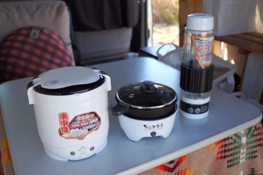 棚に並ぶのは車内でも使える調理ギア。ちょもかさんにとっての3種の神器は左から、