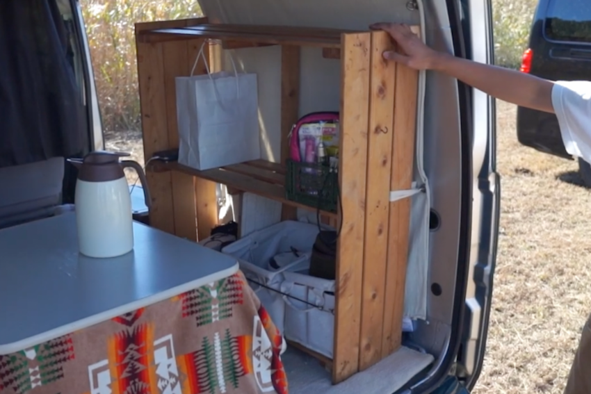 お母様がDIYで作ってくれた棚を、ずれないように強力マグネットで車体にしっかり固定。車内を自宅の部屋のような雰囲気にしてくれているアイテムです。運転の揺れで棚に入れた荷物が飛び出さないよう、ホームセンターで購入したゴムをつたわせる工夫もすぐに真似したいアイデアですね。