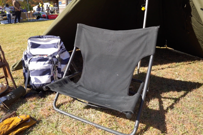 テントとのバランスを意識して、友人に譲ってもらったというDODのタキビチェア。この椅子に座って、ゆったり焚き火をするスタイルにずっと憧れていたのだとか。他のギアともマッチしています。