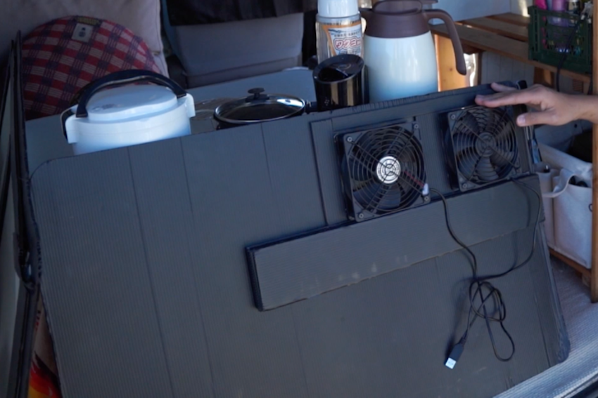 普段は簡易的なカーテンで済ませることも多いそうですが、ご自身で作ったプラスチック製のダンボールを窓にはめることも。「そのまま貼れば真っ暗になって朝までぐっすり眠れますし、夏だと虫が入ってこないように網戸をつけています。小窓にはパソコン用のファンをつけて、調理したときの煙や匂いを外に出す換気扇の効果が。磁石で簡単に取り外せるようになっていて、裏返して付けると今度は扇風機としても使えます」。まさかパソコン用のファンがこんなふうに使えるとは!思ってもみなかったアイデアですね。