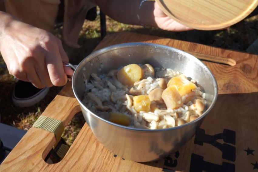 シェラどんぶりに材料を入れて炊き、蒸らすだけの簡単調理! ズボラキャンパーにも安心な料理です。干しいもの甘味が全体に行き渡り、一度食べたら箸が止まらなくなります。蒸らし時間が短いとお米の芯が残るので、できるだけ長めに蒸らしたほうがいいでしょう。
