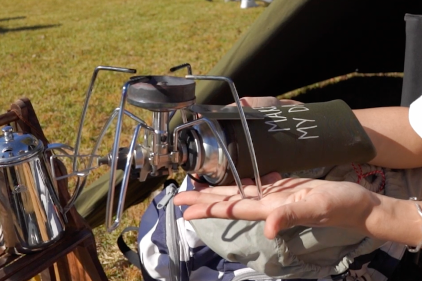 「デザインが好き」という、お気に入りのシングルバーナー。ガス缶のカラーが浮かないよう、100均のペットボトルホルダーを使っているのもナイスアイデアですね!