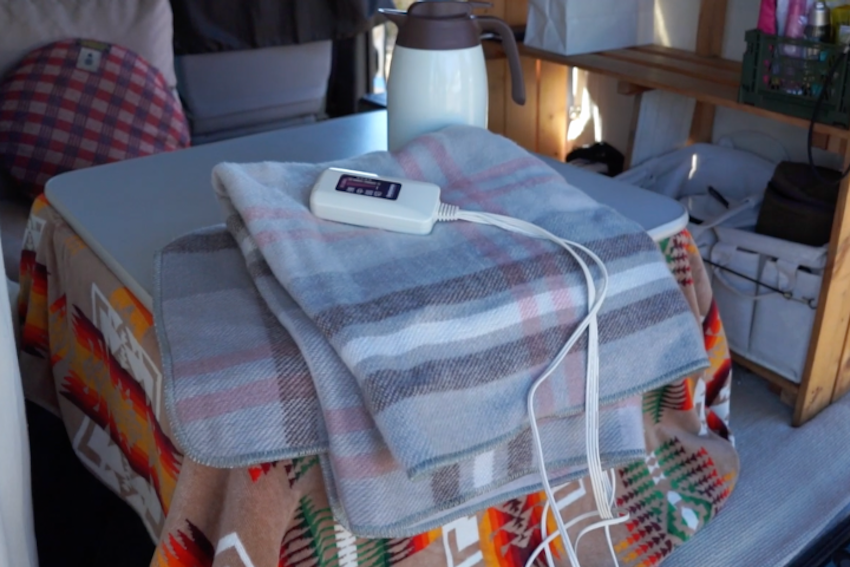 こたつの中で寝袋と電気毛布を使うことで、さらに温かな空間を作りだしているそうです。実はこれは2021年の進化バージョン!昨年は、ポータブル電源の容量が足りなかったために、湯たんぽで暖を取っていたのだとか。