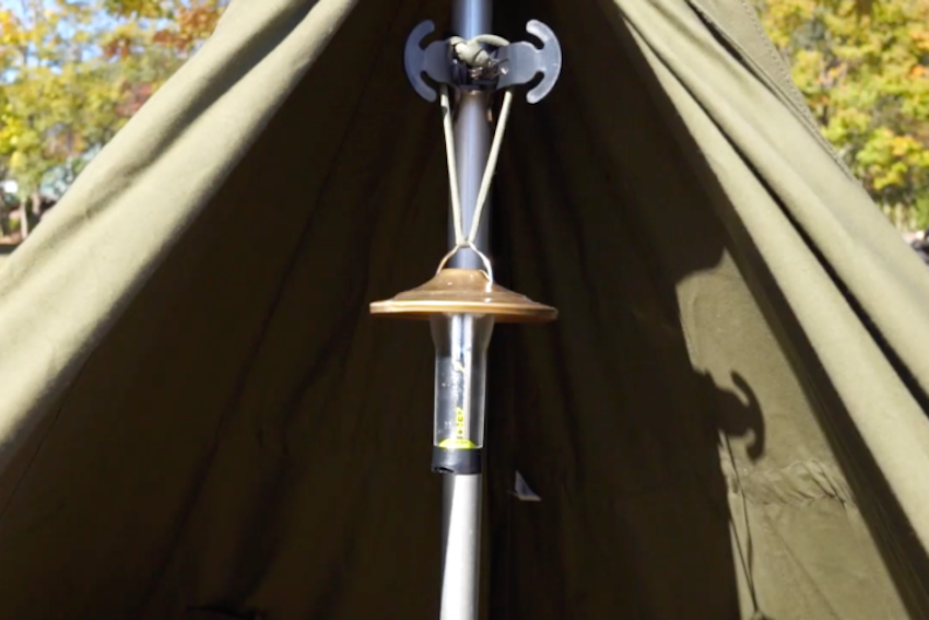 テントから下げているのは、大人気GOAL ZEROのライト。「今まで大きいのを使っていたんですが、これは明るいのにとてもコンパクト!底面のUSBコネクタから充電できるのもよいです。友達の手作りのシェードを合わせています」