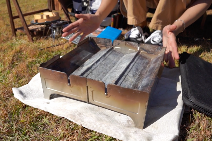 「すごくコンパクトになるんです!」と感動気味におすすめしてくれた焚き火台。薄い黒いケースに、本体はもちろん、火吹き棒など関連グッズもまとめて入れられます。しかも、組み立ても片付けもあっという間!高さのない焚き火台なので、まるで直火をやっているような気持ちになれるんだそうです。