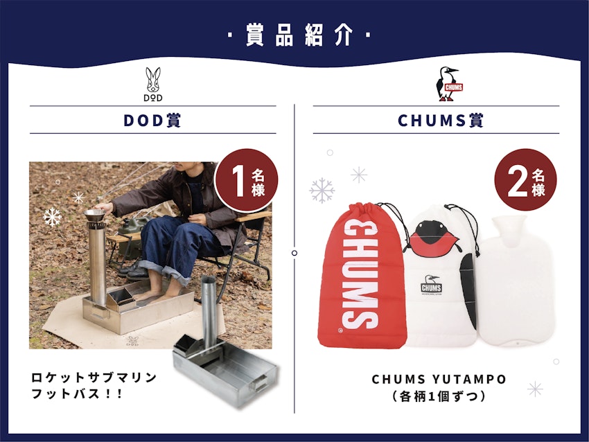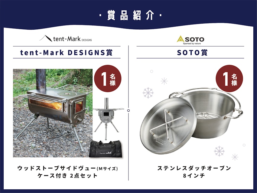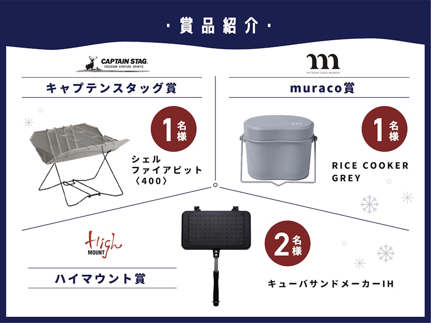 冬のキャンプのサイトや焚き火の様子、料理など、みなさんの冬キャンプの思い出をご応募ください!ご応募いただいた中から、抽選でアウトドアメーカーの賞品をプレゼントします。
