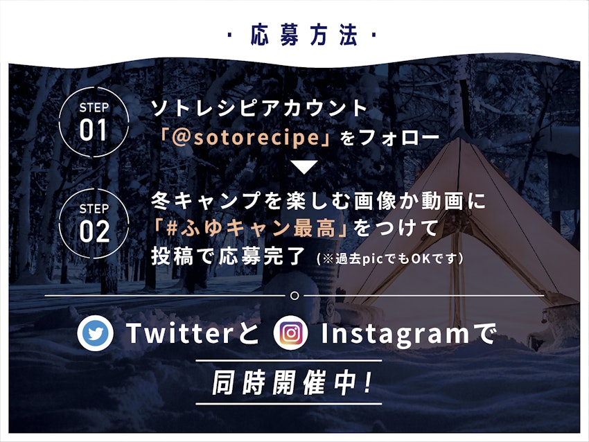次に、TwitterかInstagramの、応募したいSNSで冬キャンプを楽しむ画像か動画を「#ふゆキャン最高」をつけて投稿してください。これで応募は完了です。