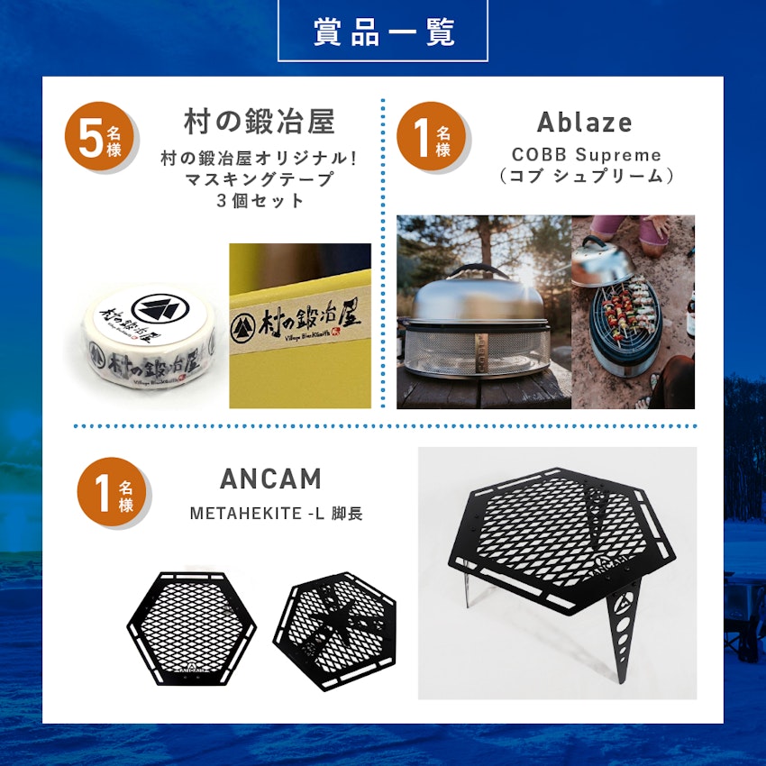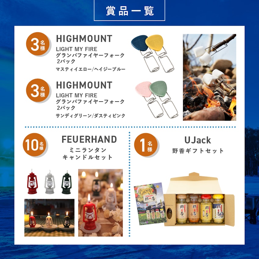 応募期間はInstagramとXともに2023年12月26日(火)〜2024年2月28日(水)まで。冬のキャンプのサイトや焚き火の様子、料理など、みなさんの冬キャンプの思い出をご応募ください!ご応募いただいた中から、抽選でアウトドアメーカーの賞品をプレゼントします。