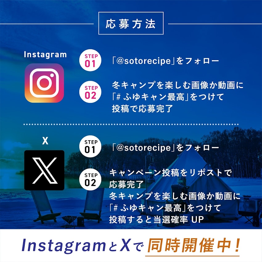 「#ふゆキャン最高」キャンペーンはInstagramとXで同時に開催しています。応募簡単2ステップです。