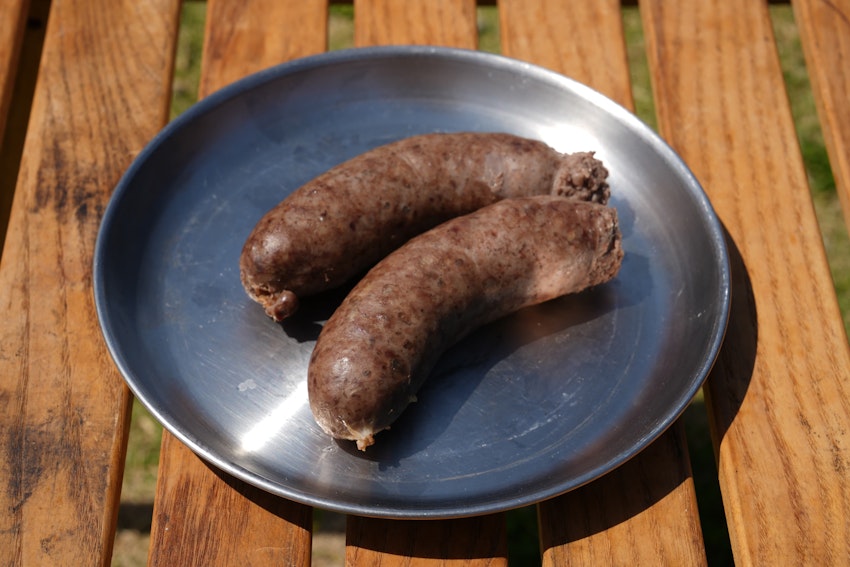 鹿ソーセージは、南伊豆の地元の猟師が獲った天然の鹿肉を使ったソーセージ。南伊豆の鹿は薬用植物でもあるアオキバが大好物で、美味しいものを食べて自由に森を走り回って育った鹿肉なので、ジューシーで美味。南伊豆でジビエ商品を提供する森守さんの逸品。