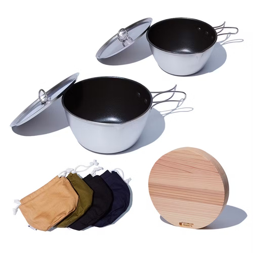 ①軽量なアルミ製+フッ素加工で洗い物が楽になるソトレシピプロダクツのヒット商品「シェラどんぶり2レギュラー&ジュニア」がセット。「伊豆の極めし2」を温めたり、カレーのご飯を炊く時のお供に便利。