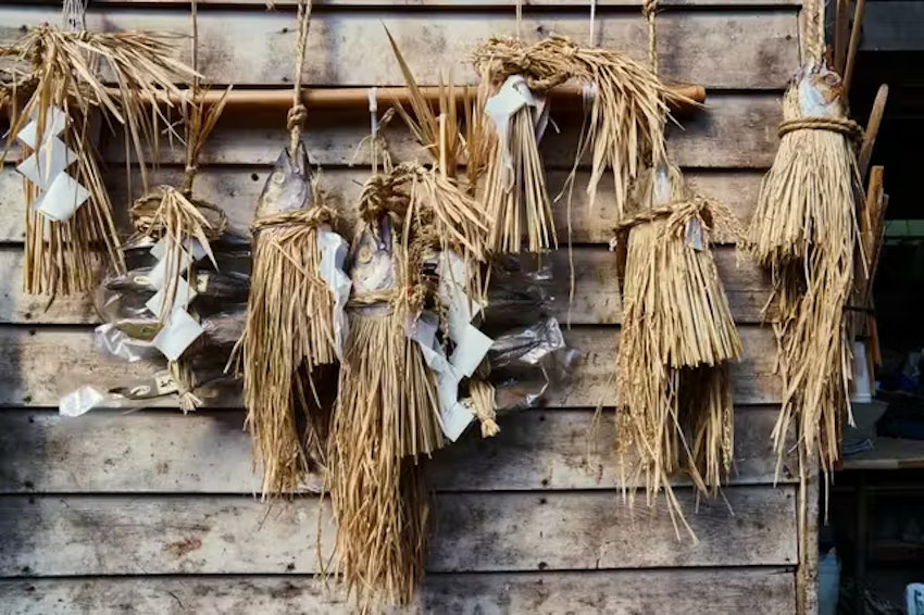 この西伊豆町ならではの食材が「潮かつお」です。潮かつおとは、西伊豆田子地区に伝わる鰹の塩漬けを干した保存食です。かつては漁師の家で航海の無事と豊漁豊作を祈願して「正月魚(しょうがつよ)」として神わらで作ったお飾り(写真参考)を神棚に供えたり、正月に振る舞われる縁起物として伝承されてきた伝統料理。