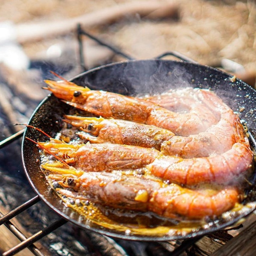 優秀賞1人目は、焚き火と鉄フライパンで調理するキャンプならではのガーリックシュリンプを投稿いただいた @yusuke.outdoorさん!エビ好きにはたまらない一品。匂いだけでビールがすすむのだとか。無骨なキャンプスタイルも魅力的です。