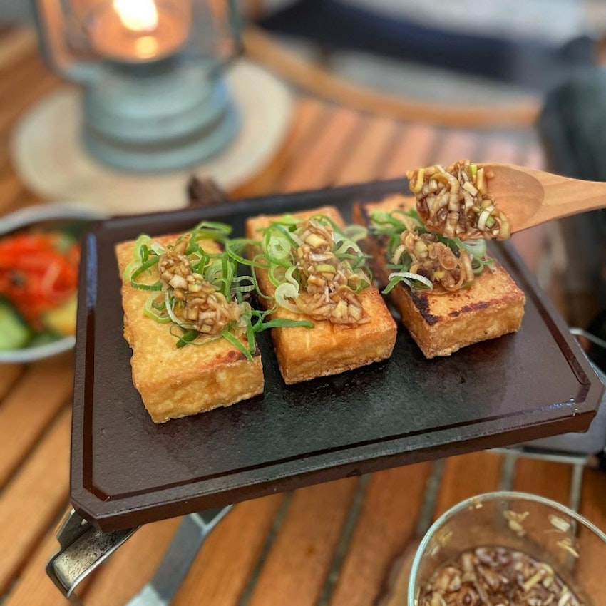 敢闘賞2人目は、@jkaj_cさんです!ご投稿いただいた「厚揚げステーキ」は、シンプルながら油淋鶏ソースが食欲をそそる一品。厚揚げの香ばしい焼き加減がたまりません。ソロキャンプのおつまみなんかにもぴったりです!