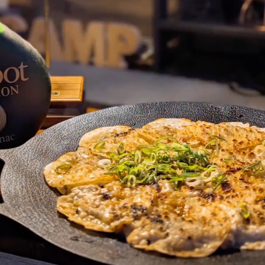 優秀賞1人目は、@8.campさんの「包まない!キムチーズ餃子」です!餃子の皮を並べてタネをサンドするように焼くことで、キャンプでも簡単に餃子ができちゃいますね!アイデア抜群のアレンジレシピです。