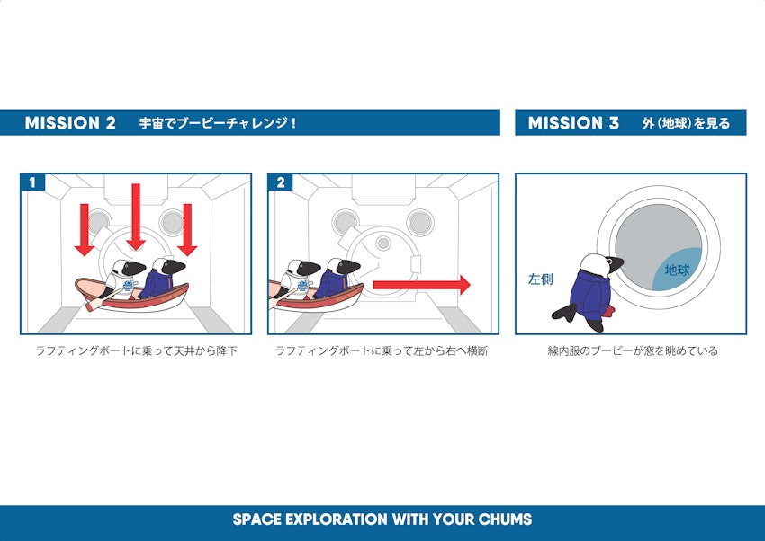 今回このブービーバードたちが、Jump SuitsとSpace Booby T-Shirtをまとい、国際宇宙ステーション(ISS)の「きぼう」日本実験棟に登場します!