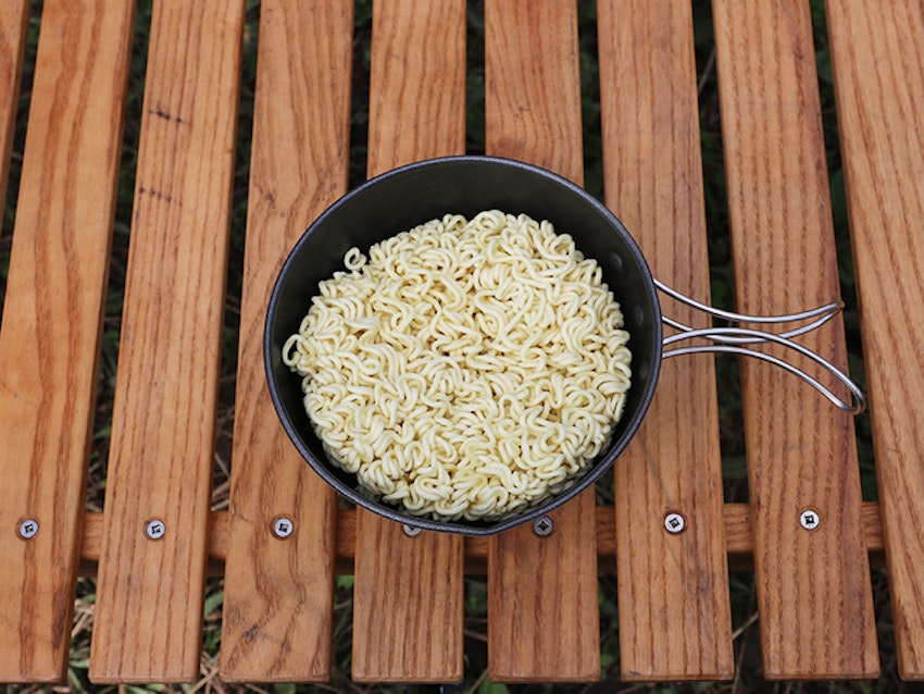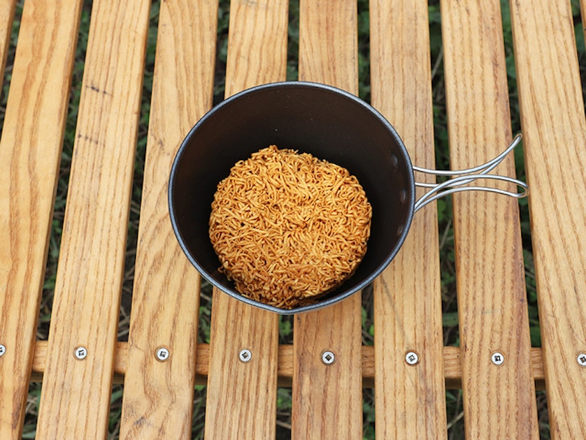 最初にごま油で豚肉を炒めてから水を入れて煮立たせ、そこに辛ラーメンを入れれば完成!辛いもの好きの方や、冬キャンプで温まりたいときなんかにおすすめのレシピです。