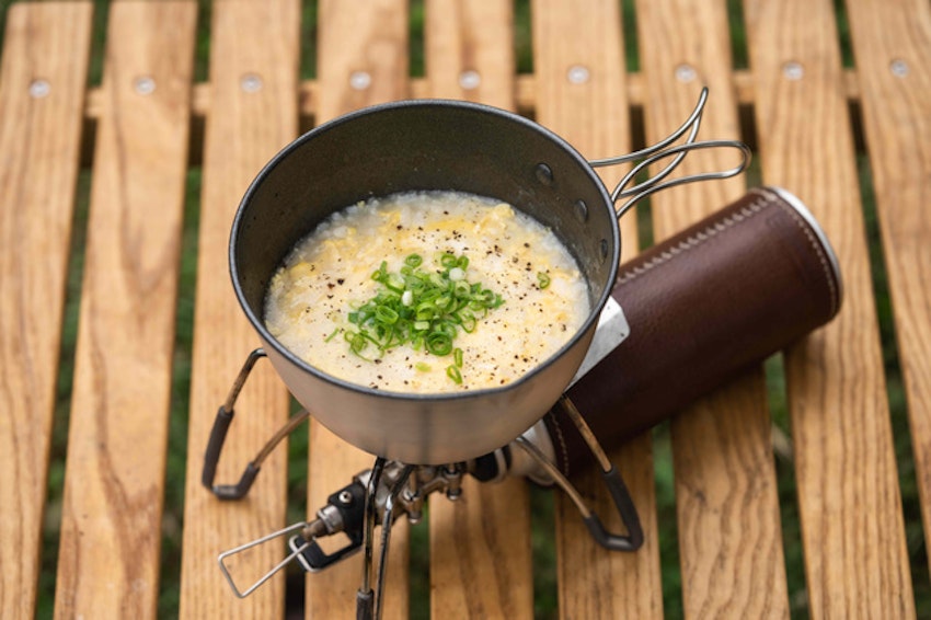 最後に小ネギを振って「鶏雑炊」が完成!〆として食べてもいいですが、お腹いっぱいになっていたら蓋をしてスープを翌朝までとっておき、キャンプの朝食として食べるのもグッドです。