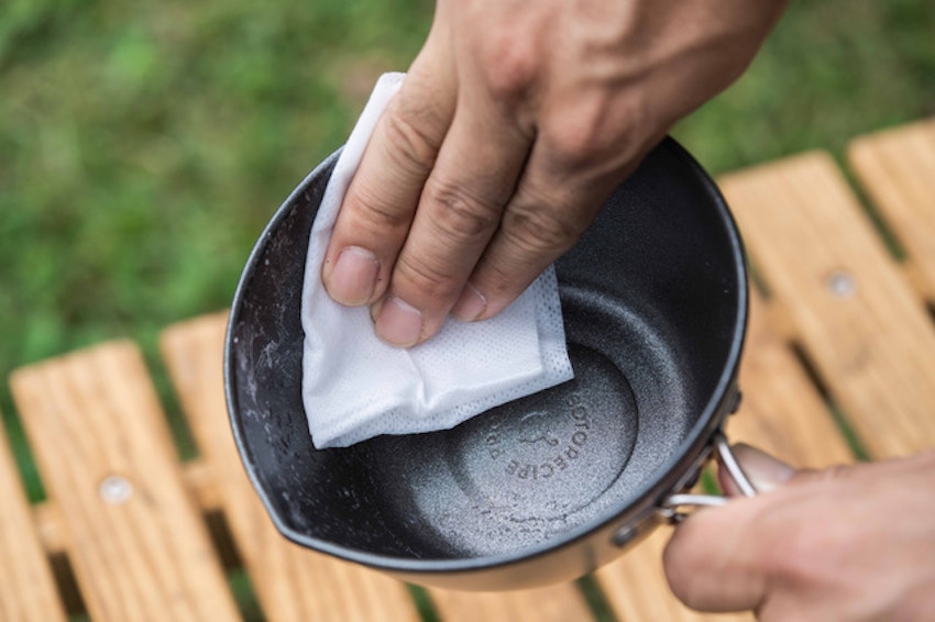 フッ素コーティングが施されたシェラどんぶり2は、ウェットティッシュで拭くだけで大半の汚れは落ちます。キャンプ場で洗い物をせずに、家で持ち帰って洗うということもでき、キャンプ場周辺の環境にも良いのです。