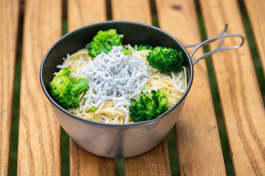 ジュニアで茹でて湯切っておいたブロッコリーと、しらすを山盛りにすれば、湯切って混ぜるだけの簡単ペペロンチーノの出来上がり。