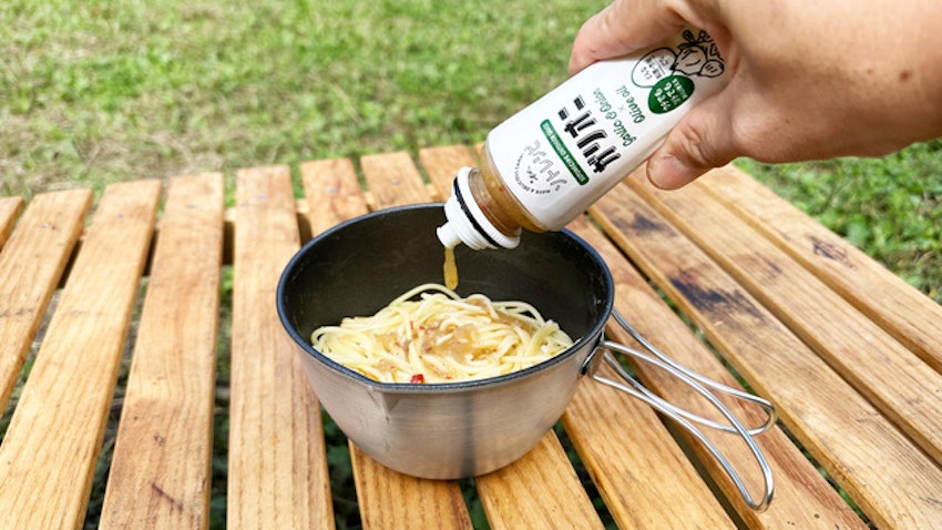 そして、オリーブオイル×ガーリック×オニオン」のソトレシピアウトドアソース「ガリオニ」を回しかけ、混ぜ合わせます。
