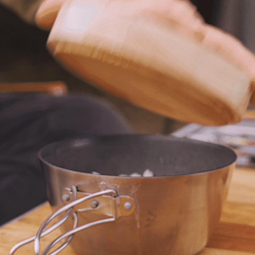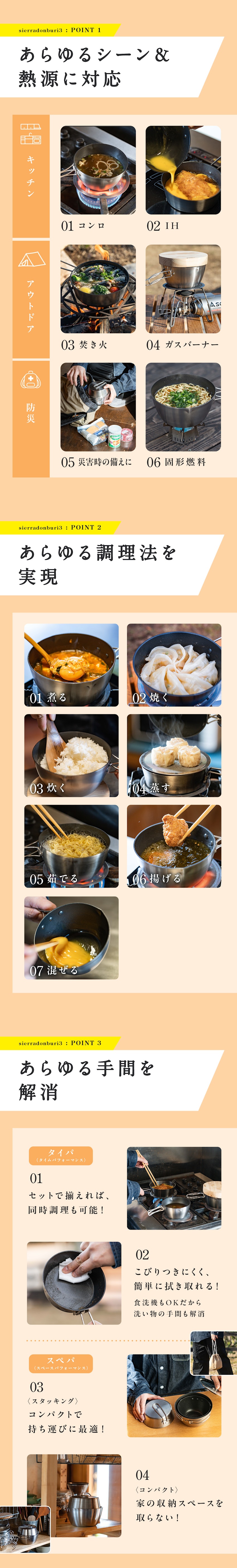 外側が頑丈な「ステンレス層」になったことによって、ガス、固形燃料だけでなく、家庭で便利なIH調理も可能になりました。また、アルミニウム性だったシェラどんぶり2は不規則な熱源である焚き火は推奨していませんでしたが、ステンレス層によって、キャンプでも焚き火料理を楽しめるようになりました。