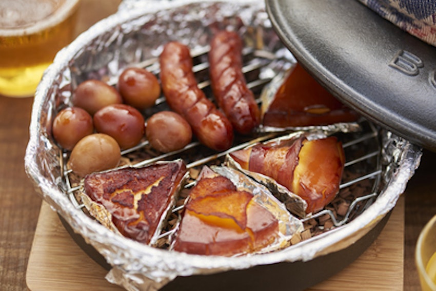 フタを使うことで、鍋やダッチオーブンのような使い方ができます。アサリの白ワイン蒸しなどの蒸し料理や、スペアリブなどの煮込み料理もでき、底網を併用すれば燻製も可能です。フタの上に熱した炭を置けば上からも熱が加わりオーブンのように使えます。