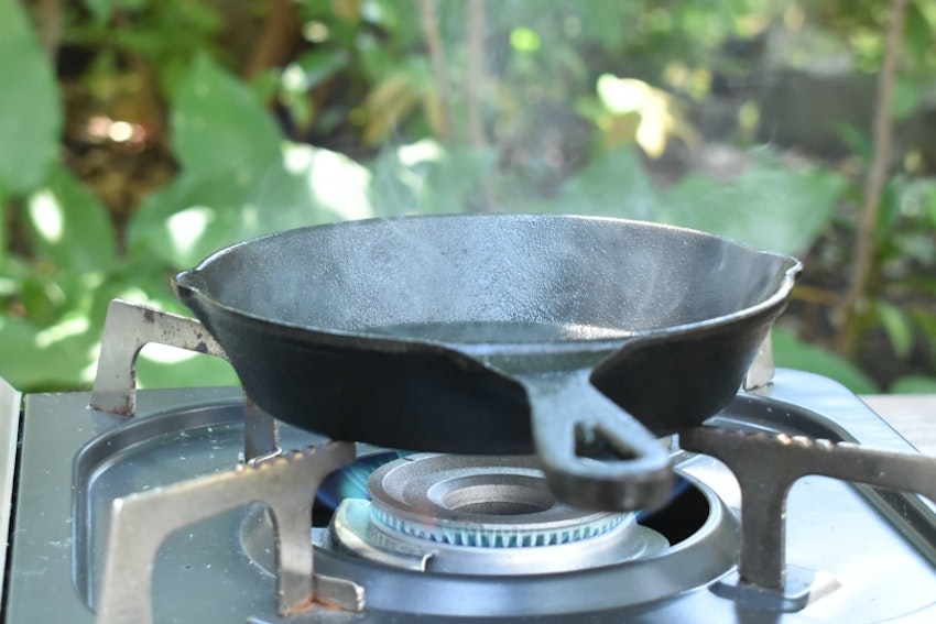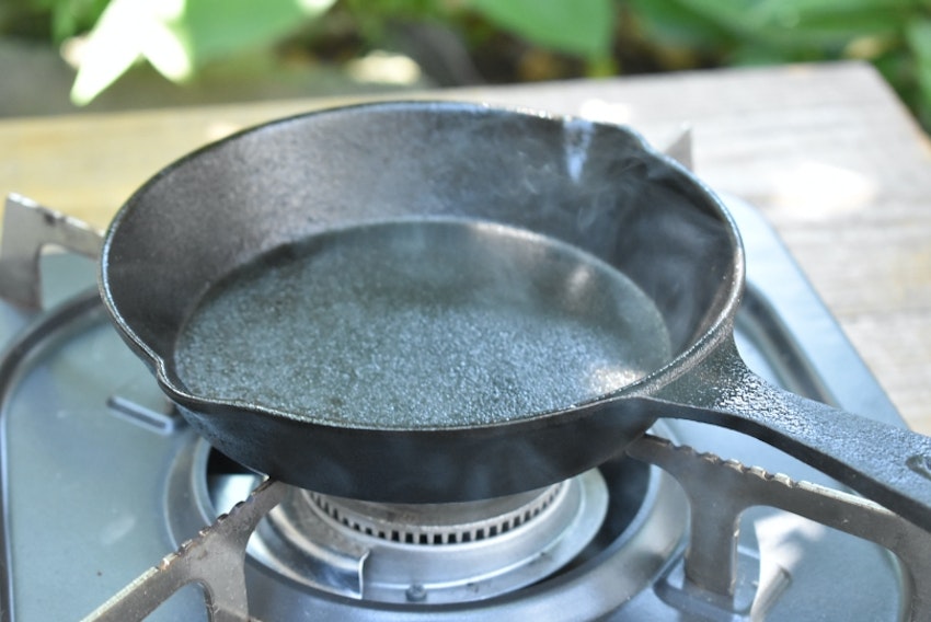焼き料理の場合、使用前に空焚きして余熱をしっかりすると焦げ付きづらくなります。スキレットの表面についた水分が揮発し、食材とスキレットにこびりつくのを緩和してくれます。