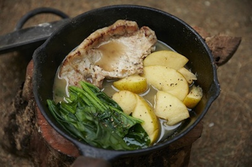 3. オリーブオイルとバターを熱したスキレットへ豚ロースとりんごと共に入れてソテーする。