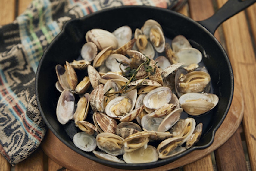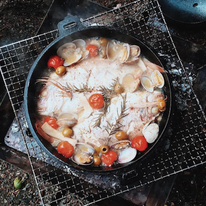 5. スキレットに蓋をして約15分火にかける。タイに火が通り、アサリが口を開けたら完成。