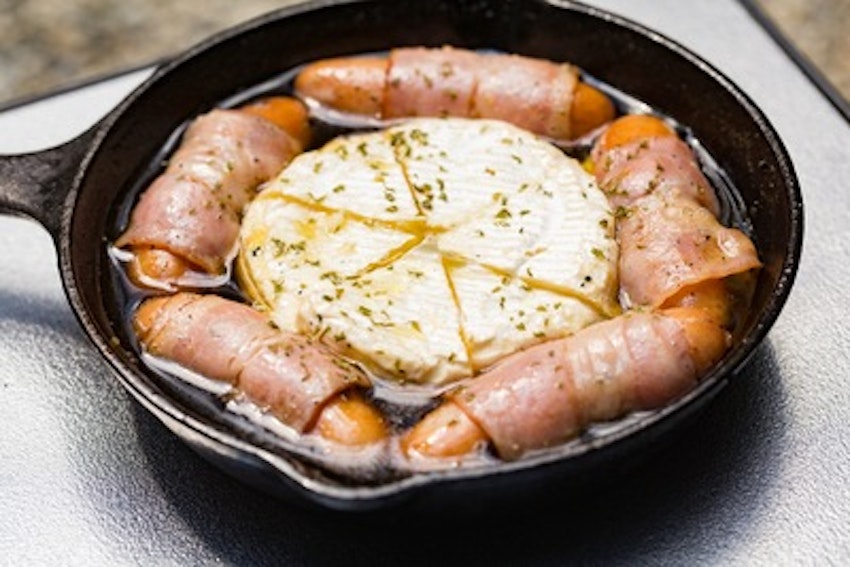 4. にんにくの香りが立ってきたら①とウインナーベーコンを並べ、浸る程度のオリーブオイルを加えて煮る。チーズがほどよく溶けてきたら完成。