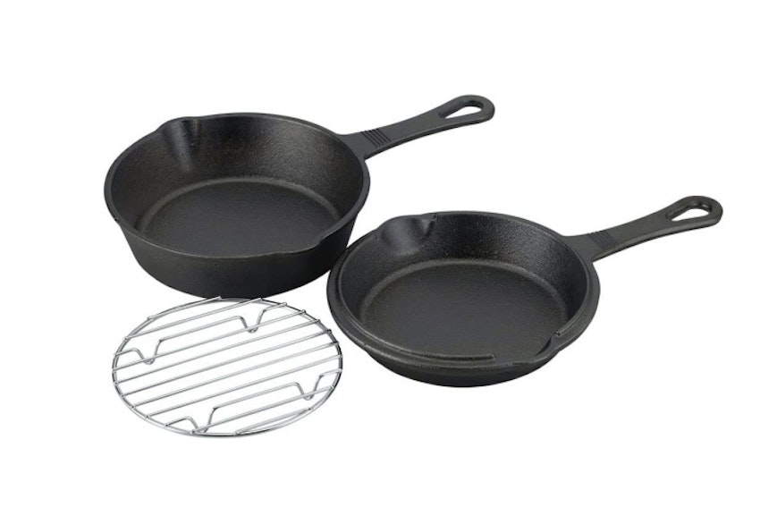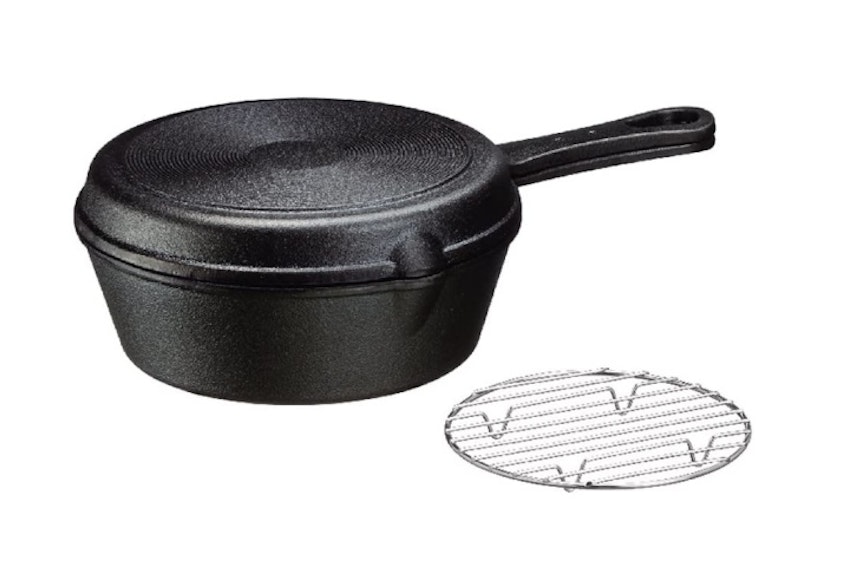 主にフライパンや鍋を多く取り扱っている新潟のブランド、和平フレイズのビーズ 鉄スキレットコンボセット15cm。本体の他にフタとしても扱えるスキレットや、燻製や蒸し焼きが楽しめる網が付属しているお得なセット。それぞれのスキレットが浅型・深型と深さが異なるので調理メニューが分けやすく、これだけのセットで2000円台という破格の価格設定になっています。