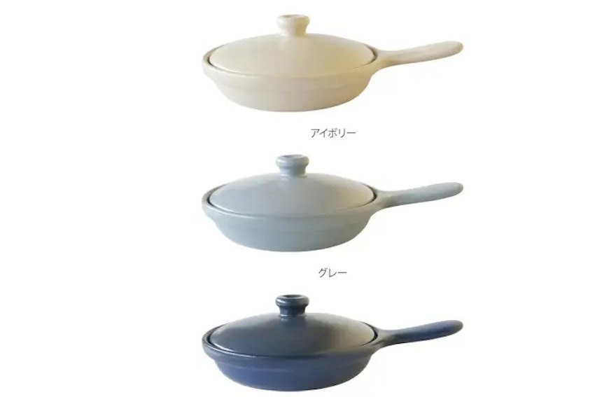 アイボリーやグレー、ブルーなど優しいカラーリングと風合いが楽しめる、GRILLERの蓋付きスキレット。横幅21cmのソロキャンプで使いやすい絶妙なサイズ感と、煮込み料理をしても安心な適度な深さが特徴の耐熱陶器製モデル。比較的コンパクトで持ち運びやすく、小さめのコンロや焚き火台でも安定して使うことができます。フタが付属しているので、料理の幅が広げられるのが嬉しいですね。