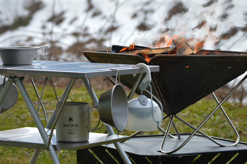 種類は様々ですが、アイアン製やステンレス製のテーブルは火の粉が飛んだり煤がついてしまっても汚れにくく、熱した調理器具もそのまま乗せられるので非常に便利。焚き火と合わせて使うならローテーブルがおすすめ!姿勢を変えることなく、集中して焚き火を楽しめます。