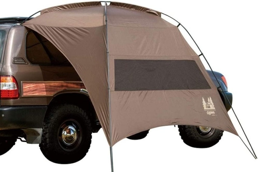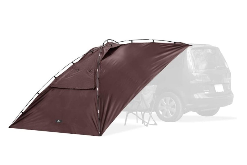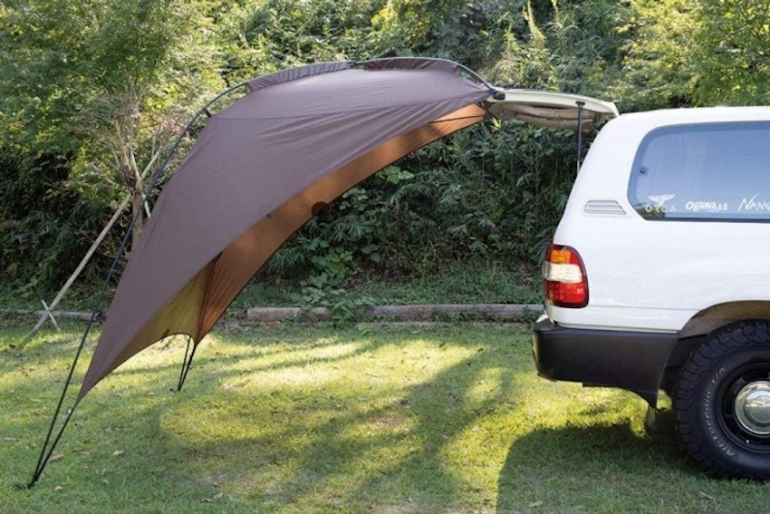 自動車にドッキングするように設営するタイプのタープ。設営工程も手軽で、車中泊をする人におすすめ。