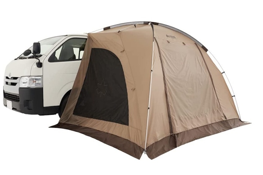 大型ミニバンでも使用出来る大きめなサイズ感でゆったりとした居住感が特徴で、テーブルやチェアを置いても快適に過ごせます。フロントと両サイドはメッシュパネル・全オープン・クローズとその時に応じた使い方ができるうえ、タープポールを使うと跳ね上げまで出来る使い勝手のいいモデルです。