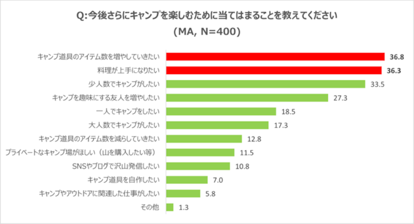 「今後さらにキャンプを楽しむため」にしたいことを聞く質問では、「キャンプ道具のアイテム数を増やしていきたい」が36.8%と最も多い回答となり、次に「料理が上手になりたい」が36.3%と続きました。キャンプユーザーの道具消費意欲と、食体験を豊かにすることへの関心が高いことから、今後もこの領域の消費が伸びると予想されます。