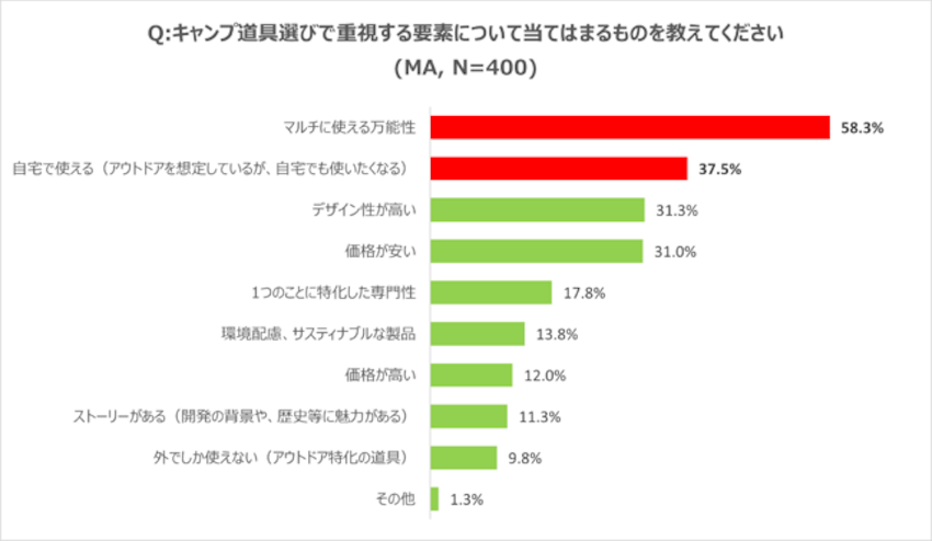 さらに、「キャンプ道具選びで重視する要素」について聞く質問には、「マルチに使える万能性」が58.3%と最も多く、次に「自宅で使える(アウトドアを想定しているが、自宅でも使いたくなる)」が37.5%と続きました。