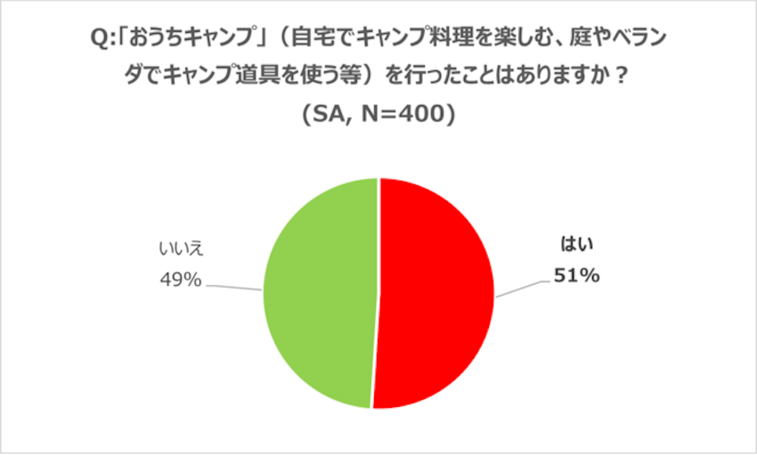 コロナ禍で話題になった“おうちキャンプ”に関して、「おうちキャンプ(自宅でキャンプ料理を楽しむ、庭やベランダでキャンプ道具を使う等)を行ったことはあるか」という質問には、約2人に1人が「行ったことがある」と回答しました。