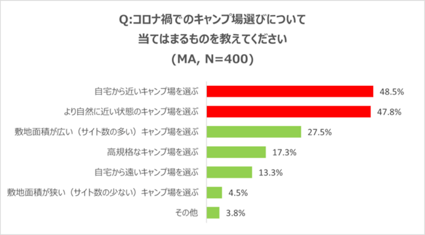 また、同様に44.9%が「公共交通機関を使わない旅行だから(自動車で移動するから)」と回答しており、出発・移動・滞在の全ての行程で、キャンプがコロナのリスクを避けながら過ごせるレジャーとして広く認知がされていることが分かります。