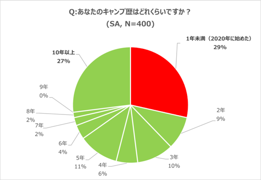 今回調査を行った400人に「キャンプ歴」を聞くと、約3割が「1年未満」と回答しており、2020年のコロナ禍にキャンプを初めた人が多いということが数字で明らかになりました。