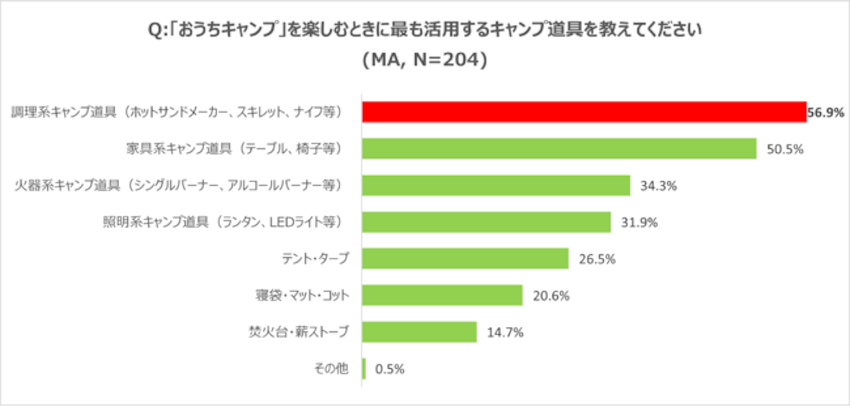 さらに、「おうちキャンプを楽しむときに最も活用するキャンプ道具」に関する質問でも「調理系キャンプ道具」と回答した人が56.9%と最も多い結果となり、キャンプの楽しみ方の象徴として“食”という要素が最も重要だと考える人が多いということが分かります。