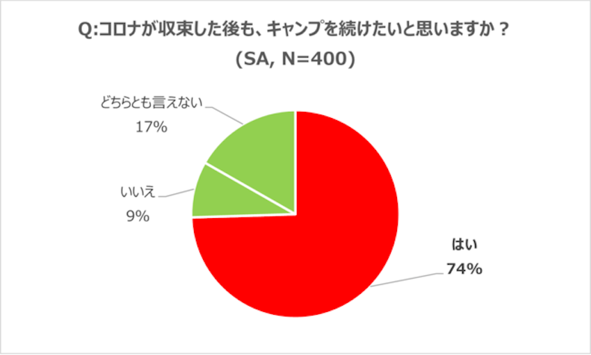 「コロナが収束した後も、キャンプを続けたいか」という質問に対しては、74%が「はい」と回答しており、コロナ禍による一過性のブームではなく、コロナ収束後の“ポストコロナ時代”に移行しても定着したレジャーとして楽しまれる可能性は高いと予想されます。