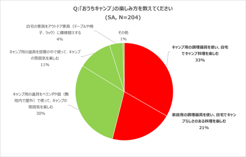 また、「おうちキャンプの楽しみ方」としては、「キャンプ用の調理器具を使い、自宅でキャンプ料理を楽しむ」が33%と最多となり、普段と違う器具を使うことが、調理自体を楽しむことにつながっていると言えます。
