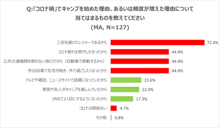 さらに、「コロナ疲れを癒やしたかったから」「外出自粛で在宅が続き、外で過ごしたくなったから」がそれぞれ44.9%と、コロナウイルスによるストレス解消を目的とする回答も続きました。