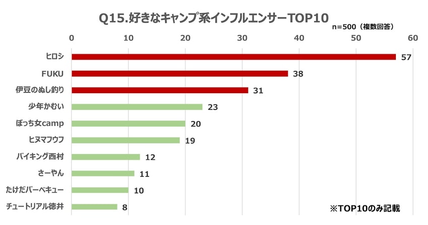また好きなキャンプ系インフルエンサーを調査したところ、1位はキャンプ芸人としてもお馴染みの「ヒロシさん」、2位はキャンプ系YouTuber「FUKUさん」、3位もキャンプ系YouTuber「伊豆のぬし釣りさん」がランクインしました。YouTubeを情報の収集源にしている方が多いことから、YouTubeのチャンネル登録者数が多い方に票が集まったように見受けられます。