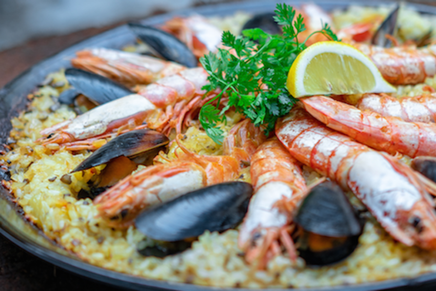 5.水、コンソメ、パエリアの素を入れてエビ・ムール貝をのせる。