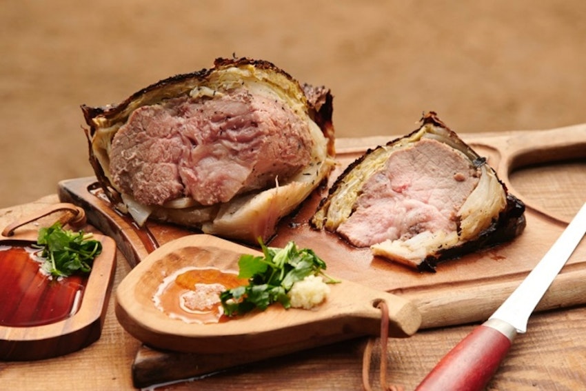4.ダッチオーブンに3を敷き詰め、2の豚肉を入れて1時間程炭火の中に置いて完成。